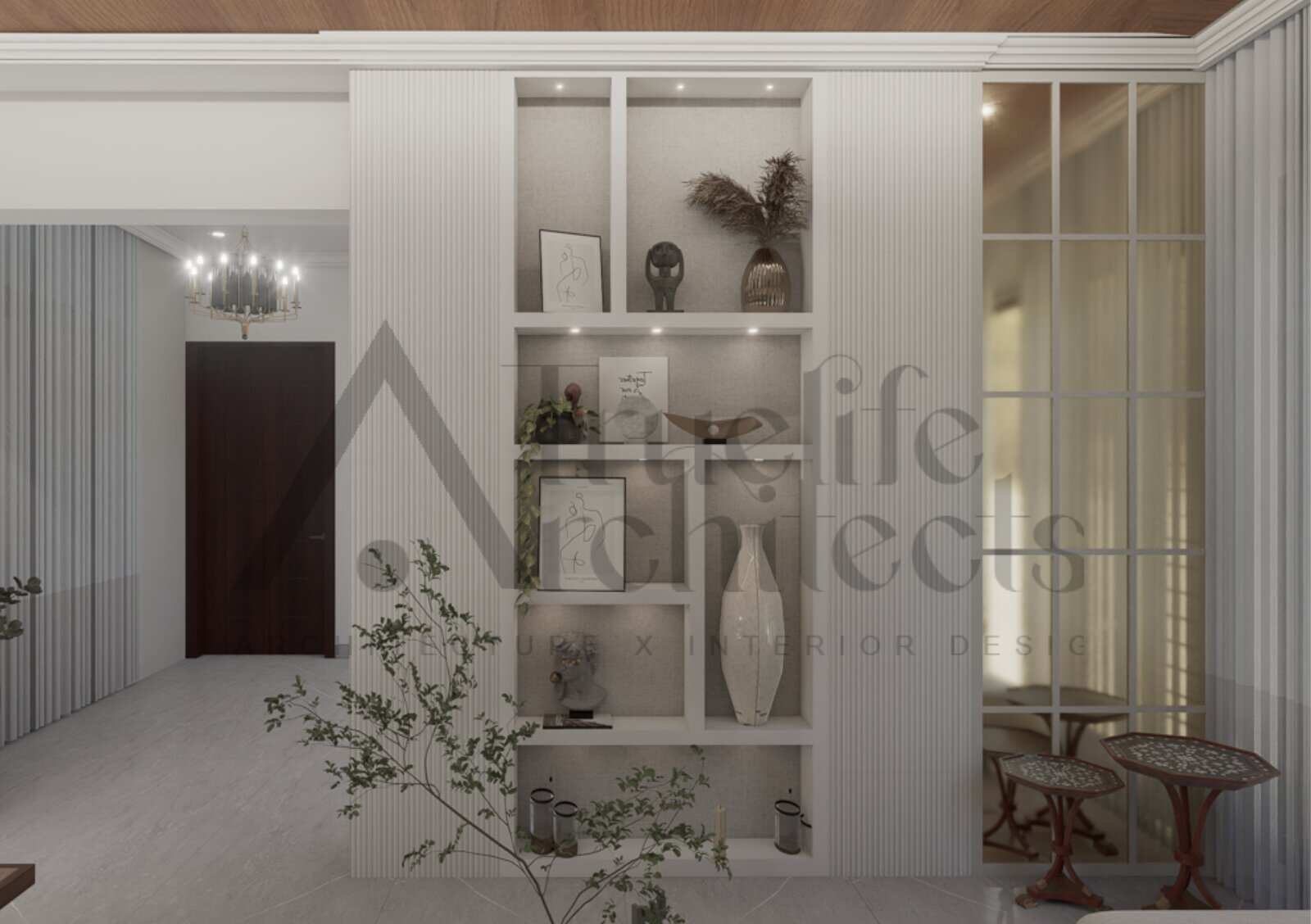 A palette of wood tones across the ceiling and furniture lends warmth, while a thoughtful mix of modern and antique pieces reflects both familiarity and freshness. The predominantly white interiors are uplifted with pops of colour in the furniture — adding vibrancy without overwhelming the calm backdrop.